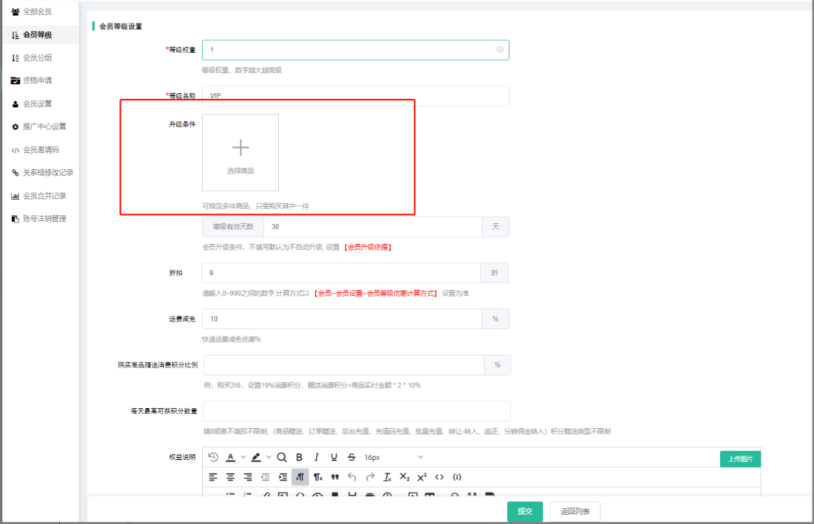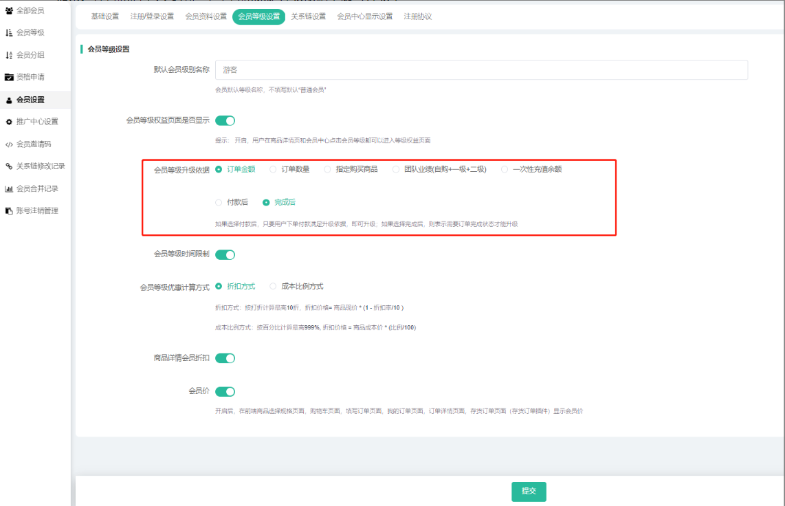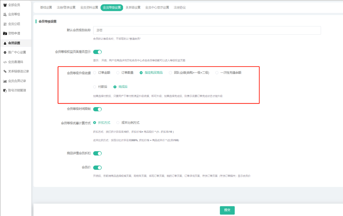 (2)订单/购买商品升级条件可设置付款后/完成后