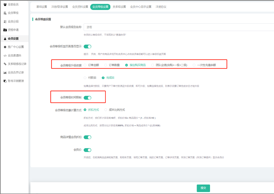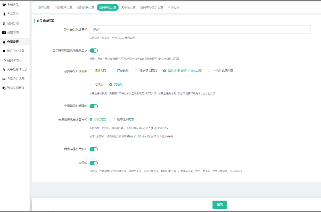 所有成为商城的会员等级为默认等级,可以通过后台-会员管理手动调整会员等级,也可以设置会员自动升级。