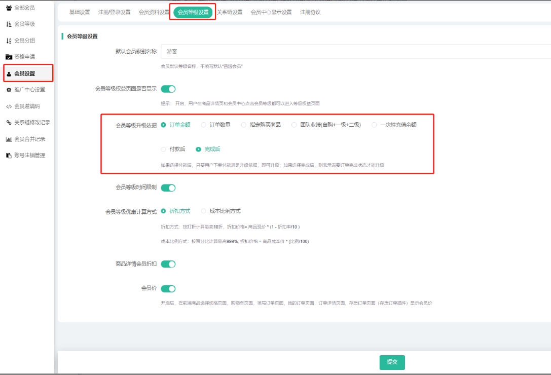 依据包括:订单金额、订单数量、购买指定商品自动升级、团队业绩(自购+一级+二级)、一次性充值余额等方式等。比如选择依据为订单金额,则会员等级条件设置为会员消费订单金额满XXX元后升级到该等级。订单升级依据支持选择订单付款后、完成后进行统计。