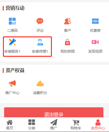 4. 申请被通过审核后台,会员中心入口变为安装服务和安装师傅