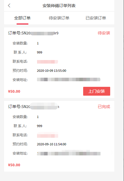 1.用户点击预约安装后,系统会自动指派对应区域的安装师傅上门安装(商家也可在进行更改自行指派安装师傅),其后安装师傅可进入安装师傅插件查看订单详情以及点击上门安装