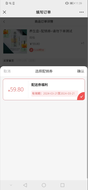 6、前端订单下单了(即提交订单未支付)就会显示配销券已使用,商城后台需要订单支付成功了才显示。订单关闭/订单退款关闭配销券会返还.