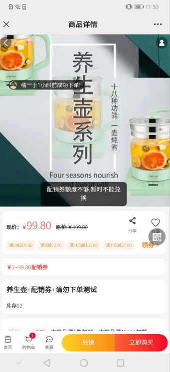 3、配销券使用限制:例如一个100的产品,配销券只有80,则无法兑换,如果配销券有110,则可以兑换,但是剩余10个券自动消失.