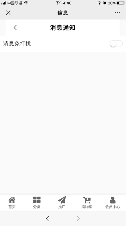 消息免打扰页面,用户可开关消息免打扰(此功能只针对APP的免打扰通知),目前APP暂不支持,为后期做准备!