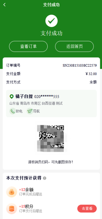 5、门店自提点订单:显示自提点信息、门店信息、若核销节点选择支付后,还会显示核销码