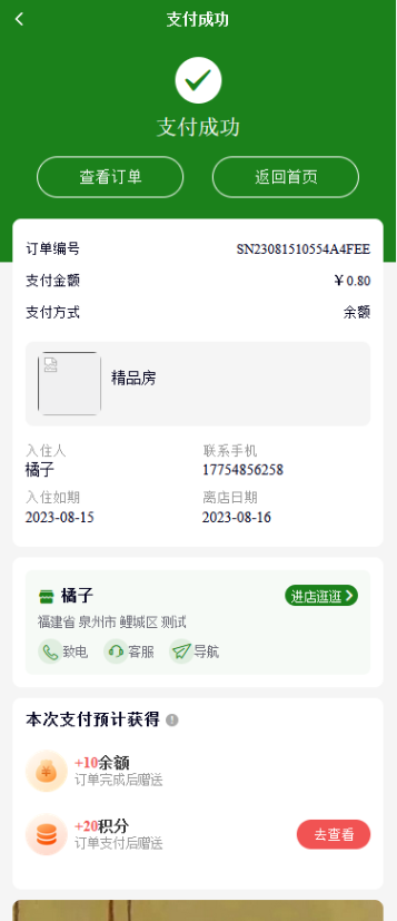 6、酒店商品:显示酒店商品名称、入住信息、酒店信息,点击进店会跳转到酒店主页